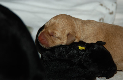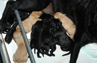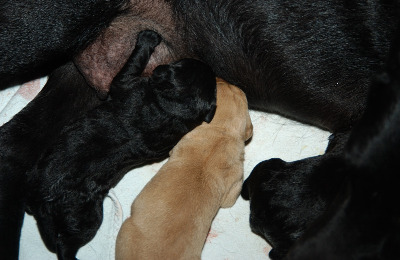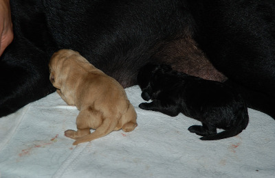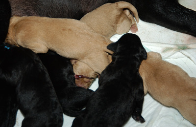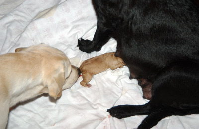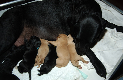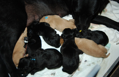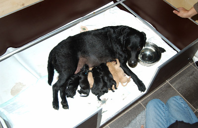 Nach einer langen anstrengenden Nacht ist der B-Wurf auf der Welt. Unsere Emma hat heute acht Welpen geworfen, vier Rüden (drei schwarze und ein gelber) und vier Hündinnen (zwei schwarze und zwei gelbe).