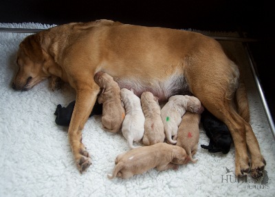 Am Nachmittag des 5. Mai hat Wilma 8 Welpen geworfen: 1 Rüde und eine Hündin schwarz, 2 Rüden gelb und 4 Hündinnen gelb. wir freuen uns auf 8 turbulente Wochen :-) weitere Fotos Folgen!