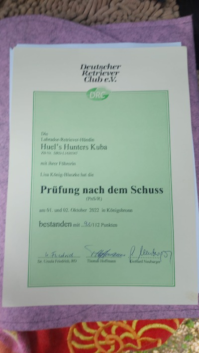 Zu einer mit der höchsten Jagdprüfungen im DRC, der PnS (Prüfung nach dem Schuss), waren Lisa und H'H Kuba "Cassie" nach Königsbronn angereist. Die Prüfung erstreckt sich über 2 Tage und stellt hohe Ansprüche an das Team: 600m Übernachtschweissfährte ohne Richterbegleitung in max. 90 min, Verlorensuche im Wald, Haarwildschleppe 500m, Einweisen im Feld, Markierung und Blind, Standruhe, Verlorensuche im Wasser, Einweisen auf Schleppspur, Apport unter Ablenkung und Gehorsam. Viele Aufgaben die es zu bewältigen gab und Cassie hat sie alle gelöst und konnte als Suchensieger die Prüfung bestehen! Ein ganz dickes Waidmannheil an euch beide.