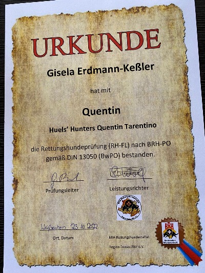H'H Quentin Tarentino absolviert die Begleithundeprüfung (BH/VT) beim BRH und einen Tag später besteht er mit "Sehr gut" die Rettungshundeprüfung /Fläche. Herzlichen Glückwunsch an Gisela Erdmann- Kessler und Quentin!