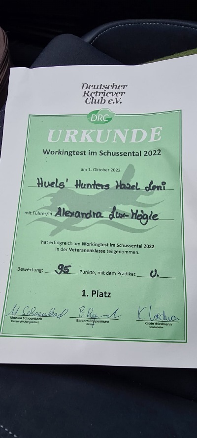 H'H Hazel Leni startet mit Alex beim Workingtest im Schussental und erreicht in der Veteranenklasse den 1. Platz mit einem "Vorzüglich". Leni ist inzwischen über 10 Jahre alt, aber immer noch sehr fit und leistungstark, wie das Ergebnis zeigt. Herzliche Glückwünsche an euch beide! Bleib weiterhin so gesund und munter!