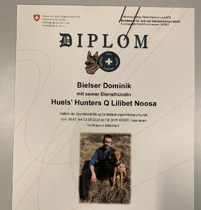 Herzlichen Glückwunsch an H'H Q Lilibeth Noosa und Dominik Bielser. Sie haben als Team die Grundausbildung für Betäubungsmittelspürhunde in der Schweiz bestanden und dürfen nun beim Zoll eingesetzt werden. Allzeit gute Suche!