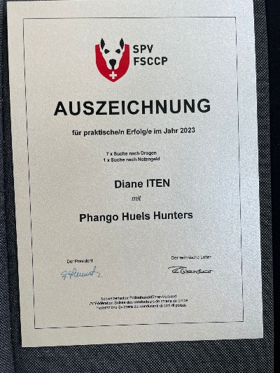 Bei dem SMF "Verein Schweizerischer Militärhundeführer" haben Tobias mit H'H Ocean und Diane mit H'H Phango am 28./29. September teilgenommen. Geprüft wurden sie in der Wettkampfdisziplin Betäubungsmittelspürhunde. Wir gratulieren ganz herzlich Ocean und Tobias zu einem großartigen 2. Platz und Diane zu einem guten 10. Platz.
