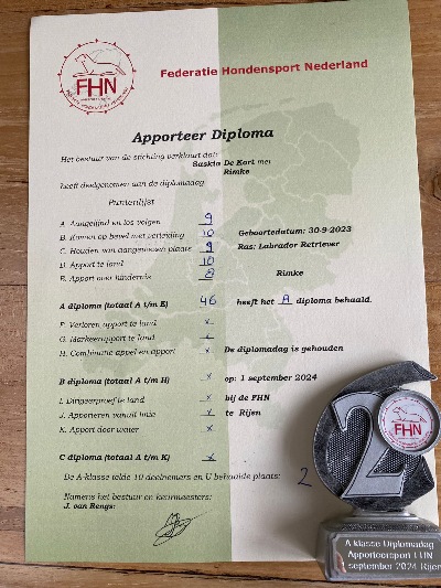 Saskia und H'H Twinkling Rimke haben in den Niederlanden bei der FHN das "Apportier Diploma C " mit dem 2. Platz absolviert. Nun dürfen sie offizeil an Workingtests teilnehmen. Herzlichen Glückwunsch Saskia !