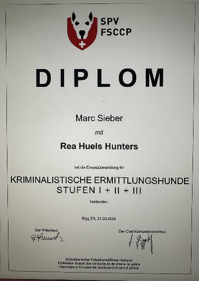 H'H Rea und Marc Sieber haben in Zürich die große Prüfung als Leichen - und Blutspürhund in drei Stufen bestanden. Das bedeutet: Stufe I: Suche und Anzeige von menschlichen Leichen, Stufe II: Suche und Anzeige von Blut und Stufe III: Suche und Anzeige von Sperma. Insgesamt waren 11 Suchanlagen zu absolvieren, darunter: Gebäudedurchsuchung, Suche nach vergrabener Leiche, Suche entlang von Waldwegen, Suche in der Höhe, Fahrzeugdurchsuchung, Suche im Freien, um nur einige Bereiche zu nennen. Herzlichen Glückwunsch an Marc und Rea! Derzeit gibt es wohl nur drei einsatzfähige Hunde wie Rea in der Schweiz und so wird einiges an Arbeit auf ich zukommen.