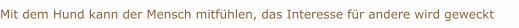 Tiere finden durch ihr einfaches und natürliches Verhalten oft schnell einen Weg zu Menschen. Durch den Kontakt zum Hund ist schnell ein Gespräch hergestellt und auch die Heimgäste, die sonst eher teilnahmslos dasitzen und anscheinend in ihrer Welt versunken sind, öffnen sich und genießen den Körperkontakt zum Tier.