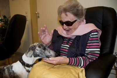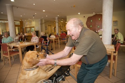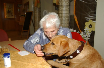 Da aktuell unsere Mutter im Seniorenheim ist, nehme ich regelmäßig einen meiner Hunde zum Besuch mit. Viele Hausgäste freuen sich sehr und genießen den Hundekontakt.