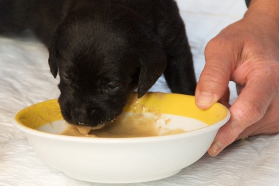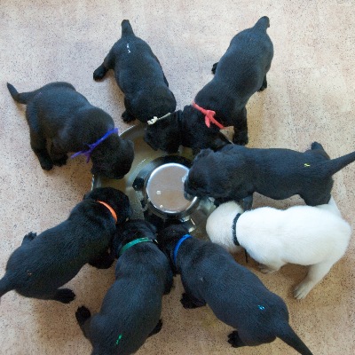 Die mütterliche Milchbar wird durch ein zusätzliches Nahrungsquelle erweitert: den Futterring! Und darin bietet sich mit zunehmendem Alter der Welpen einreichhaltiges Angebot: über Obst, Quark, Trockenfutter, Rinderhack und Pansenl ernen die ‚Welpen viele verschiedene Futter kennen.