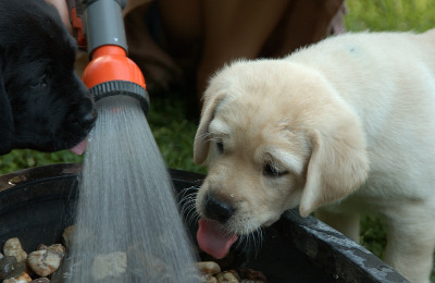 Bei großer Hitze ist eine Abkühlung mit der Gartenbrause fürunsere Welpen eine willkommene Abwechslung und auch schon der Grundstein fürdas spätere „Abduschen des schmutzigen Hundes nach einem Spaziergang durch denMatsch, gelegt.