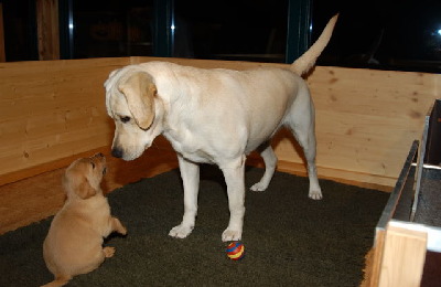 Mit dem Öffnen von Augen und Ohren gegen Ende der 2.Lebenswoche nimmt die Wahrnehmung der Welpen an ihrer Umwelt ständig zu und die körperliche Aktivität verwandelt sich von einem vorwärts Robben in einen unsichern Gehversuch. Jetzt wird die Wurfkiste zu eng und wir öffnen die„TORE“.